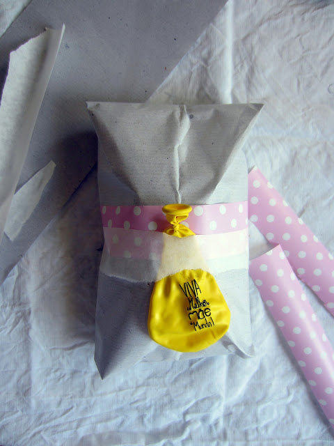 Entretanto peguei num balão, enchi e escrevi a minha mensagem para a minha Mãe. Depois foi só rebentar o balão ao pé do nó, e prender com as fitas ao presente! Não fica um amor?